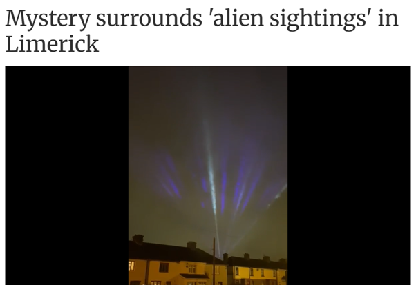 I first became aware of this story 2 years ago when researching UFO activity in or around Limerick City. The first 5 links on Google were articles relating to supposed ‘alien sightings’ in the north side of Limerick city. A review of each link found that the supposed sightings were, in fact a light show rehearsal at Thomond Park.