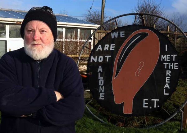 I became enamored by the photos of Gerry , one of which was him standing looking very stern in front of a trampoline on its side, with the words ‘We are not alone. I met the real E.T’, painted on it.