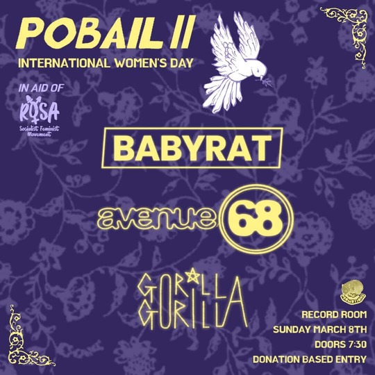 Seth Collins of Wombat Promotions has assembled 3 female-fronted bands for this concert: Babyrat from Cork, Avenue 68 from Dublin and Gorilla Gorilla from Cork. Tickets are donation based and can be bought on the door.